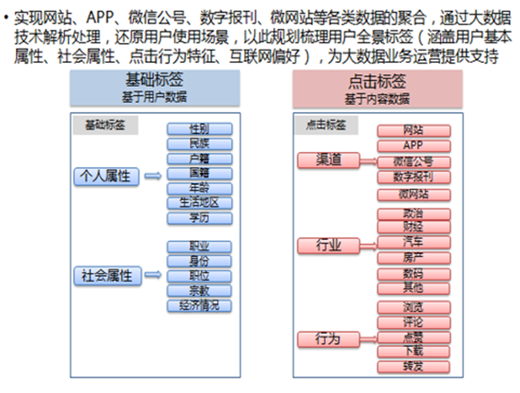 1. 用户阅读行为包括用户在新闻网站、新闻APP、微信小程序、数字报刊、微网站上的各种浏览行为,阅读行为数据包括:点击数据、站内搜索数据、阅读停留时间数据、来源网站数据、收藏数据、转评赞数据等。